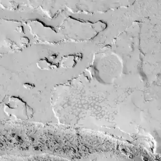 ![]() Parte de Lethe Vallis, visto por HiRISE. El flujo fue de suroeste a noreste. La parte más amplia de Lethe Vallis tenía menos poder erosivo, por lo que las mesas quedaron atrás del material preexistente. | ||