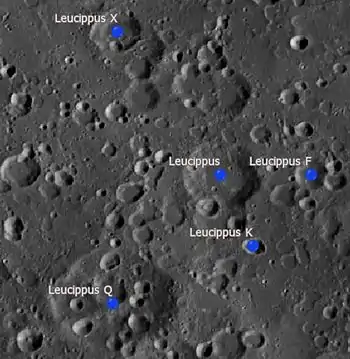 Por convención estos elementos son identificados en los mapas lunares poniendo la letra en el lado del punto medio del cráter que está más cerca de Leucippus.