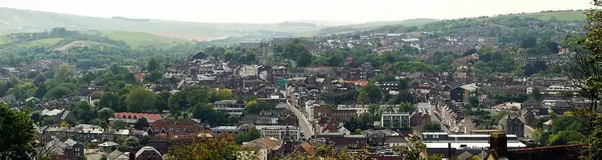 Las colinas de los South Downs se alzan por encima de ambas orillas del río. La High Street, y el núcleo antiguo de la ciudad, ocupan la ribera derecha, subiendo con mucha pendiente desde el puente; la parte alta de esta orilla, 2,5 millas (4 km) se conoce como monte Harry. En la ribera izquierda hay un gran acantilado de yeso (Cliffe Hill) que se puede ver desde lejos.
