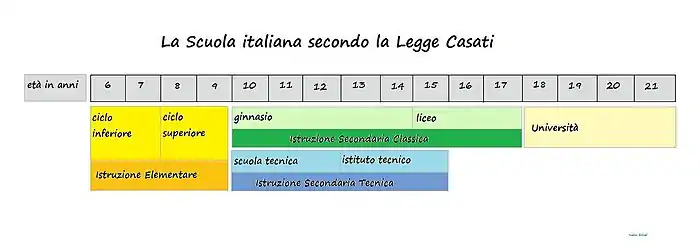 Ley Casati, 1861, n. 3725 del Reino de Cerdeña, entró en vigor en 1861 y fue extendida con la unificación a toda Italia (Regio decreto de 28 de noviembre de 1861, n. 347). La ley, que tomó el nombre del ministro de Instrucción Pública Gabrio Casati y fue sucesora de las leyes Bon Compagni de 1848 y Lanza de 1857, reformó de manera íntegra el ordenamiento escolar, desde la administración a la articulación escolar por órdenes y grados y los materiales de enseñanza, confirmando la voluntad del Estado italiano de hacerse cargo del deber de intervenir en materia escolar en sustitución de la Iglesia católica, que durante siglos había sido la única institución preocupada por la instrucción.[1]