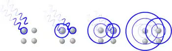 En el diagrama que sigue se esquematizan rayos X que inciden sobre un cristal. Los átomos superiores reemiten la radiación tras ser alcanzados por ella. Los puntos en los que la radiación se superpone constructivamente se muestran como la zona de intersección de los anillos. Se puede apreciar que existen ángulos privilegiados en los cuales la interferencia es constructiva, en este caso hacia la derecha con un ángulo en torno a 45°.