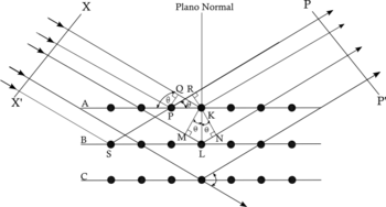 Considérese la figura de la derecha conformada por planos de átomos distanciados a una longitud d. Para el primer plano, las rayos 1 y 1a golpean los átomos K y P los cuales son dispersados en todas la direcciones; pero para cierta dirección, estos rayos (1’ y 1a') se encuentran en fase y por lo tanto se cumple que: