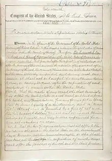 En 1879, sin embargo, California adoptó una nueva Constitución que autorizaba explícitamente al gobierno estatal a determinar a qué personas se les permitía residir en el estado, y prohibía a los chinos trabajar en corporaciones y gobiernos estatales, del condado o municipales.[16] Tres años más tarde, después de que China aceptó las revisiones del tratado, el Congreso intentó nuevamente excluir a los trabajadores chinos de la clase trabajadora; El senador John F. Miller de California introdujo otra Ley de Exclusión China que bloqueó la entrada de trabajadores chinos durante un período de veinte años.[17] El proyecto de ley fue aprobado por el Senado y la Cámara por abrumadores márgenes, pero también fue vetado por el presidente Chester A. Arthur, quien concluyó que la prohibición de 20 años era una violación del tratado renegociado de 1880. Ese tratado permitió sólo una suspensión "razonable" de la inmigración. Los periódicos orientales elogiaron el veto, mientras que los estados occidentales lo condenaron. El Congreso no pudo anular el veto, pero aprobó un nuevo proyecto de ley que reduce la prohibición de inmigración a diez años.[17][18] La Cámara de Representantes votó 201 a 37, con 51 abstenciones, para aprobar la ley.[19] Aunque todavía se opuso a esta denegación de entrada a los trabajadores chinos, Arthur accedió a la medida de compromiso, firmando la Ley de Exclusión China en ley el 6 de mayo de 1882.[17][18]
