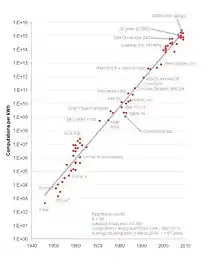 La ley de Koomey describe una tendencia de largo plazo en la historia de equipamiento computacional. El número de computaciones por joule de energía disipada se ha venido doblando aproximadamente cada 1,57 años. Esta tendencia ha sido extraordinariamente estable desde los 1950s (R2 de más del 98%) y de hecho ha sido un poco más rápida que la ley de Moore. Jonathan Koomey articuló la tendencia como sigue: «Para una carga computacional fija, la cantidad de batería que necesitas caerá por un factor de dos cada año y medio».[1]