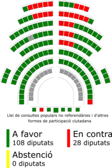 El 19 de septiembre, la ley de consultas fue aprobada por 106 votos a favor y 28 en contra en el pleno del Parlamento de Cataluña.[15] Contó con el apoyo de CiU, ERC, PSC, ICV y CUP que suman el 79 % de los representantes del Parlamento de Cataluña; mientras que se posicionaron en contra el PP y Cs.[16] Aunque apoyó la ley, el PSC manifestó que la Ley de Consultas Populares no Referendarias y Participación ciudadana no amparaba legalmente la «consulta» prevista para el 9-N. Por el contrario, el portavoz de CiU Josep Rull afirmó que la ley «encaja plenamente en la Constitución y en el Estatuto».[17]