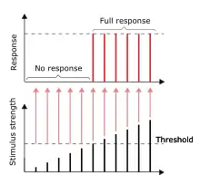 Más tarde, Keith Lucas descubrió que este principio estaba presente en el músculo esquelético en 1909.[1] Las fibras nerviosas individuales también responden a la estimulación según el principio de todo o nada.[2]