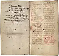 - Eleventh-century manuscript version at the Koninklijke Bibliotheek, National library of the Netherlands. This is the copy made at Monte Cassino under Constantine's supervision.[14] (Pantegni pars prima theorica (lib. I-X), includes only the first part, the theorica, subdivided in 10 chapters - signature KB 73 J 6)