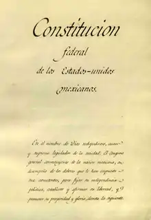 «El poder supremo de la Federación se divide, para su ejercicio: en Legislativo, Ejecutivo y Judicial, y jamás podrán reunirse dos o más de estos en una corporación o persona, ni depositarse el legislativo en un individuo.»Artículo 9.° del Acta Constitutiva de la Federación, 31 de enero de 1824.[3]