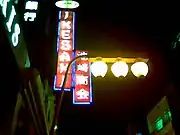 Antigua fachada de McDonald's escrita en katakana: マクドナルド ハンバーガー (Makudonarudo Hanbāgā, "Hamburguesas McDonald's").