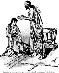 - Era hija de Abihail, tío de Mardoqueo.[15] Habiendo quedado huérfana de sus padres, su primo Mardoqueo la adoptó y crio como si fuera hija suya. Era moza de hermosa forma y de buen parecer.[14] Su nombre hebreo era Hadassa (que significa mirto) pero le fue cambiado a Ester, que es de origen babilónico y significa ‘estrella’. Fue proclamada reina en lugar de la reina Vasti, pues ganaba la gracia de todos los que la veían.[15]