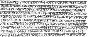 Primero, sobre cada tablilla se extiende, necesariamente, una raya plana y horizontal, las letras escritas de izquierda a derecha y todas mayúsculas. El renglón, en toda su extensión, repleto atiborradamente con letras, sin espacios. Si la palabra no estaba terminada, su final continuaba en el siguiente renglón aunque fuera por una sola letra. No existía un nuevo párrafo. No había signo de puntuación alguno. Cuando se terminaba el renglón, se extendía una nueva raya y el texto se continuaba en otro renglón. El texto continuaba de una tablilla a otra. Las tablillas no estaban numeradas.[4]