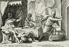 Habiéndose enterado de tal aberración, Zeus se hizo pasar por un peregrino y se hospedó en el palacio de Licaón. Este se preparó para matar al peregrino, pero, alertado por algunas señales divinas, quiso asegurarse antes de que no era un dios, como afirmaban los temerosos súbditos. Para ello hizo cocinar la carne de una de sus víctimas o de un esclavo, y se lo sirvió a Zeus. Este montó en cólera y transformó a Licaón en lobo, e incendió después el palacio que había sido testigo de tanta crueldad.