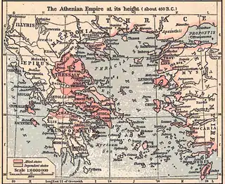 Atenas, pues, dejó a un lado el principio de igualdad, emprendió una política de poder, y la presión sobre los aliados de la Liga fue aumentando. Esto vino acompañado de la separación de una parte del territorio (cleruquía) de las zonas aliadas sospechosas de no ser dignas de confianza y el envío de colonos atenienses (clerucos) para cultivarlas .[52] Estas colonias, distribuidas en Atenas por sorteo, tenían un doble propósito: por un lado, proporcionar tierras a los ciudadanos sin tierra que las necesitaran o las reclamaran, y del otra, emplear los colonos desplazados para frenar a los aliados. Así pues, los colonos atenienses no solo recibieron el territorio conquistado, la región del río Estrimón y el Quersoneso Tracio, sino también tierras de Lemnos, Imbros, Naxos, Andros, y más tarde toda Eubea.[52] Los aliados que pudieron mantener la independencia durante más tiempo eran los que disponían de una fuerza naval importante, como Lesbos, Quios y, hasta el 439 a. C, Samos. Muchas ciudades más pequeñas pasaron a depender de Atenas, primero económicamente y después políticamente. Sus contemporáneos ya eran conscientes de ello, como deja claro el autor desconocido de la obra La constitución de los atenienses (Pseudo Jenofonte).[53]