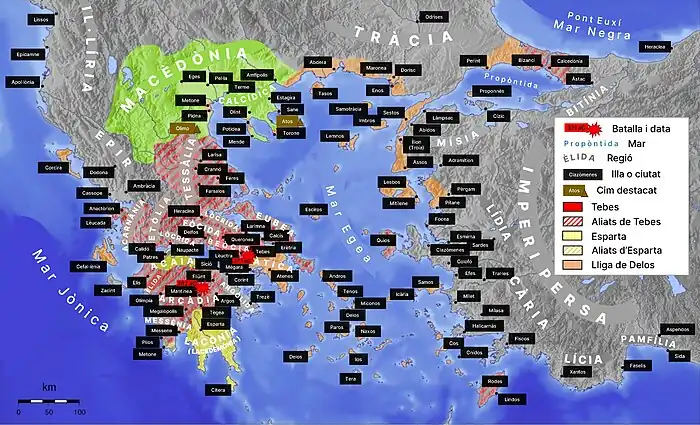 Con la victoria sobre la flota del Peloponeso en el estrecho entre Paros y Naxos, los atenienses consiguieron una vez más la supremacía naval en el Egeo. En el 375 a. C., se celebró en Esparta un congreso de paz, solicitado conjuntamente por los lacedemonios y los atenienses, en el que se concluyó una paz panhelénica, aunque de corta duración. Después de tensiones intermitentes, se renovó una vez más el año 371 a. C., pero rápidamente decayó a causa del enfrentamiento bélico de Tebas, bajo el liderazgo de Epaminondas, con Esparta. En la batalla de Leuctra, el ejército espartano sufrió grandes pérdidas que provocaron el fin de Esparta como gran potencia militar en Grecia y confirieron a Tebas la supremacía durante la década siguiente.[122]
