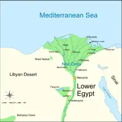 La fecha generalmente aceptada de la campaña egipcia es el 460-454 a. C.,[88] que coincide con la Primera guerra del Peloponeso. El 461 o o 460 a. C. estalló un levantamiento en Egipto que se extendió rápidamente y gran parte del país cayó pronto en manos del rey libio Inaro,[89] que pidió ayuda a la Liga de Delos. La liberación de Egipto habría supuesto una gran ventaja económica y política para los atenienses, por lo que se enviaron 200 barcos para ayudar a los sublevados, lo que supuso una importante inversión financiera.[90] Cuando los atenienses se unieron al ejército de Inaro, el rey Artajerjes I reunió el ejército para derrotar a la rebelión. Diodoro Sículo y Ctesias cifran este ejército en 300 000 y 400 000 efectivos, respectivamente, pero estas estimaciones son probablemente exageradas.[91][92]