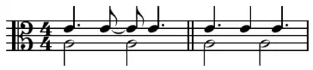 Figura 4. Ligadura a través del pulso, seguida por el mismo ritmo anotado sin ligadura.