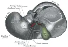 ![]() Cara inferior del hígado en la que puede verse el ligamento redondo (round ligament), | ||