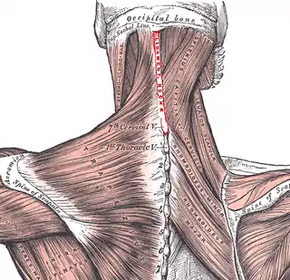 ![]() Vista posterior de los músculos que conectan la extremidad superior a la columna vertebral. Ligamento nucal marcado en rojo en el centro. | ||