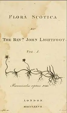 ![]() Frontispicio de Flora Scotica, 1777, del autor. Ilustración de Ranunculus reptans de Moses Griffiths, grabó Peter Mazell. | ||