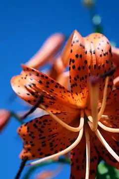 Las flores son de color naranja con puntos y es ampliamente cultivada como planta ornamental.