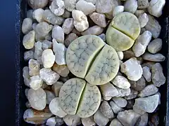 Forma grupos de dos hojas acopladas, divididas por una fisura por donde aparecen las flores. Cada par de hojas forman el cuerpo de la planta que tiene forma cilíndrica o cónica con una superficie plana. De la fisura entre las hojas brota, en periodo vegetativo, las nuevas hojas y en cuanto se abren, las antiguas se agostan.