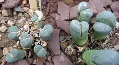Forma grupos de dos hojas acopladas, divididas por una fisura por donde aparecen las flores. Cada par de hojas forman el cuerpo de la planta que tiene forma cilíndrica o cónica con una superficie plana. De la fisura entre las hojas brota, en periodo vegetativo, las nuevas hojas y en cuanto se abren, las antiguas se agostan.