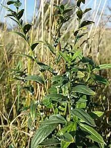 Derecha, ramosa, foliosa en su parte superior, suelen tumbarse los tallos por el peso del ramaje, áspera, perenne y llega a 1 m de altura. Las flores están en los ramilletes terminales, entre hojas, no hay muchas abiertas, son blanco amarillentas, de 4 mm de diámetro en la corola, está formada por 5 pétalos unidos a un tubo de 4-5 mm de longitud, los estambres no se ven. Cáliz con 5 sépalos estrechos y muy pilosos, rabillo de 7-10 mm de longitud. Entre los sépalos van formándose los frutos, 1-2-3 o 4 granos, de 3 mm de longitud, muy duros, con una semilla de forma parecida, de color blanco, brillante como el nácar. Hojas alternas, lanceoladas, sentadas, de hasta 6 cm de longitud y 14 mm de anchura, de punta casi roma, nerviación muy profunda, saliente en el envés, pilosidad abundante, corta en el haz, más rala y larga en el envés. Tallos leñosos en su mayor longitud, con manchas pardas longitudinales, pierden las hojas. Raíz fuerte y profunda, de la cepa salen varios tallos primarios.[1]