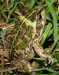 Esta gran rana es rechoncha y con ojos grandes; alcanza una longitud de 4,9 centímetros. Tiene brazos pequeños y rechonchos y piernas largas y poderosas. La superficie dorsal de la rana verrugosa puede ser de un marrón grisáceo a un verde brillante. Hay pequeñas manchas oscuras en la espalda. La piel es áspera, de ahí el nombre de "rana verrugosa".[1] Una banda oscura va desde el hocico, pasa a través del ojo y el tímpano, y llega hasta el hombro. Una línea pálida corre por el centro de la espalda. La superficie ventral es blanca y granular.