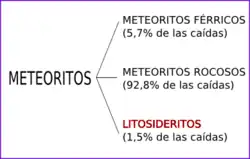 - Litosideritos: Representan el 1,5% de las caídas de meteoritos, poseen una composición intermedia entre los dos grupos anteriores.