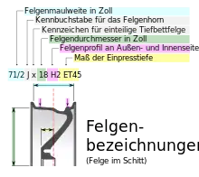 - "ET 15" = desplazamiento positivo (+) del montaje respecto al plano de simetría del rin = 15 mm (0,6 pulgadas), donde el desplazamiento negativo se precede con un signo menos, i.e. ET -15. Se expresa en milímetros;