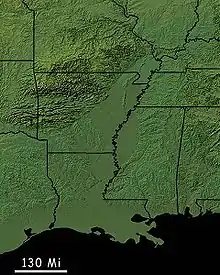 El término "embahiamiento de Misisipi" a veces se usa de manera más restringida para referirse a su sección en el lado occidental del río, que atraviesa el este de Arkansas, el sureste de Misuri, el extremo occidental de Tennessee (ribera oriental del río), el extremo occidental de Kentucky (ribera oriental del río) y el extremo sur de Illinois, y excluyendo el noroeste de Misisipi, donde la llanura aluvial se conoce como el Región del Delta del Misisipi. Este embahiamiento se considera una extensión septentrional de la llanura costera del Golfo de México,[3]y consta de un sistema acuífero que incluye diversas unidades hidrogeológicas: el acuífero aluvial del valle del río Misisipi, la unidad de confinamiento de Vicksburg-Jackson, el acuífero de Claiborne superior, la unidad de confinamiento de Claiborne medio, el acuífero de Claiborne medio, la unidad de confinamiento de Claiborne inferior, el acuífero de Claiborne inferior, el acuífero medio de Wilcox, el acuífero inferior de Wilcox y la unidad de confinamiento de Midway.[4]