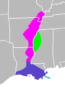 La llanura se divide en dos áreas: el delta del río Misisipi en la mitad sur de Luisiana y el embahiamiento superior del Misisipi que se extiende desde el centro de Luisiana hasta Illinois.[2]