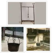 Del latín «lar, laris» (hogar), se registra su uso en Asturias, Región leonesa, Cantabria, Castilla, Madrid, Navarra o País Vasco, con las correspondiente variaciones dialectales o idiomáticas,[lower-alpha 1] y casi siempre asociado a la cadena utilizada para colgar el caldero, pero tampoco exclusivamente. En La Rioja se documenta que «sujeta los cacharros suspendidos sobre el fuego»,[4] y en Aragón se identifica con el «cremallo»,[5] y con sus supersticiones,[6] como que cuando los llares quedaban bailando, era una mala señal que anunciaba desgracias. También era frecuente en los graneros, como percha para la matanza del cerdo (jamones, chorizos etc.).