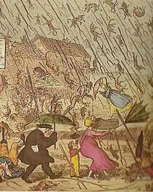 Esta expresión inglesa, que significa literalmente ‘llueven perros y gatos’, y es equivalente a la española «llover a cántaros», es quizás la referencia más conocida del fenómeno, que encontramos en el lenguaje cotidiano. Esta expresión se encuentra escrita por primera vez en la obra A Complete Collection of Genteel and Ingenious Conversation, de Jonathan Swift, de 1731. Sin embargo, el origen de la expresión es incierto.[30] Una especulación es que se trata de una distorsión del arcaísmo francés catadoupe, que significa ‘chubasco’, o ‘cascada’. Otra especulación dice que en la Edad Media, las fuertes lluvias limpiaban los techos de cadáveres de perros y gatos, haciéndolos caer en las calles.[30][31]
