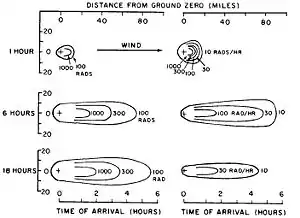 Una grave contaminación local puede extenderse más allá de la explosión y los efectos térmicos, en particular en el caso de las detonaciones de superficie de alto rendimiento. Las huellas en el suelo de la lluvia radiactiva de una explosión dependen de la situación meteorológica a partir del momento de la detonación. Con vientos más fuertes, la lluvia viaja hasta el suelo más rápido pero tarda el mismo tiempo en descender, por lo que a pesar de que cubre una mayor trayectoria, es más dispersa o diluida.[6]