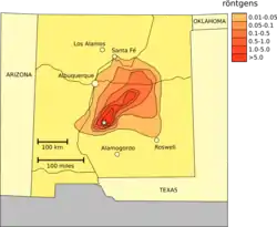 En 1976, la lluvia radiactiva debida a los ensayos nucleares atmosféricos de China produjo una dosis media en el tiroides de 3,1·10-4 rads para una persona en los Estados Unidos.[4]