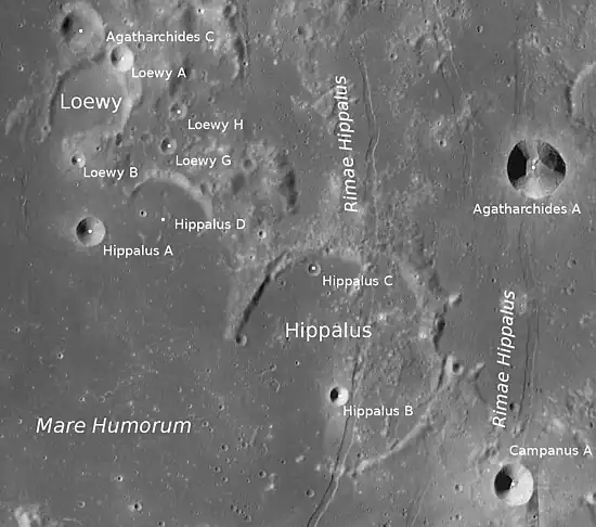 Loewy es un pequeño cráter de impacto que se encuentra en el borde oriental del Mare Humorum, en la parte suroeste de la cara visible de la Luna. Se trata de una formación inundada de lava situada al suroeste del cráter más grande, también inundado de lava, Agatharchides. Al sureste aparece una formación igualmente inundada de lava aún más grande, Hippalus.