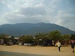 ![]() Calle principal de la localidad con el monte Longido al fondo.