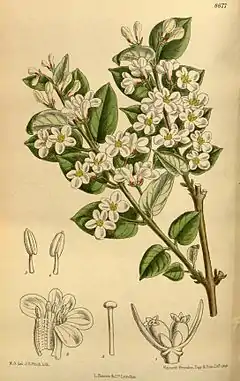 Se trata de un espeso arbusto que puede llegar a tres metros de altura erguido. Se alinea con hojas ovaladas o redondeadas de 3 a 6 centímetros de largo. La inflorescencia es generalmente un par de flores de color blanco a rosa o de color rojo carmesí, cada una de unos 1,5 centímetros de largo. Las flores son algo tubulares, sus estambres y estilos sobresalen. El fruto es una baya de color naranja brillante o rojo de hasta un centímetro de ancho. La planta forma matorrales y se propaga fácilmente cuando las aves y otros animales consumen los frutos.