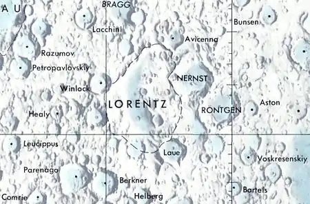 Lorentz contiene una destacable pareja de cráteres pareados, formada por Nernst (situado apenas al norte del punto medio de Lorentz), y Röntgen (unido al borde suroriental de Nernst). Atravesando el borde sur de Lorentz aparece Laue, mientras que Avicenna atraviesa el borde noroeste. Cerca del más difuminado borde este de Lorentz se halla Aston.