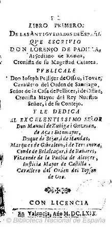 - Historia y Antigüedades de España (1538),[1] no publicado hasta 1669 en Valencia con el título El Libro primero de las antiguedades de España que escrivio don Lorenço de Padilla, Arçediano de Ronda, Cronista de su Majestad Cesarea; publícale don Josef Pellicer de Ossau, i Tovar, Caballero del Orden de Santiago...