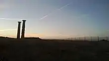 Lo primero que se encuentra el visitante que llega a Los Bañales por la población de Layana, son dos colosales columnas toscanas. Durante décadas se consideraron erróneamente un posible acceso al foro de la ciudad o parte de un mercado (macellum), pero en realidad, estas dos columnas -y otras de las que solo se conserva su base- formarían parte de un pórtico ubicado en el cruce de dos calles -de las que se conservan parte de las aceras- en uno de cuyos ángulos se ubicó una vivienda monumental, previsiblemente perteneciente a la élite local. Se trata de una vivienda, con peristilo central, al que se abrían las estancias principales, de las que se conservan partes del zócalo de piedra, en el que se apoyarían los distintos muros.[61][62]