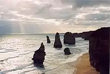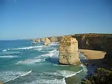 The Twelve Apostles (en español, «Los Doce Apóstoles») es el nombre con el que se designa un agrupamiento de agujas de piedra caliza que sobresalen del mar en la costa del Parque nacional Port Campbell, en Victoria, Australia. Se formaron por la erosión de las rocas y movimiento a lo largo de la ruta «Great Ocean Road». La proximidad de unas a otras es la causa de la curiosidad del paraje y lo que lo ha hecho una importante y popular atracción turística. Originalmente el sitio era llamado Sow and Piglets ("La cerda y los cerdos"). La isla Muttonbird, cerca de Loch Ard Gorge, era la «cerda» y las agujas de roca más pequeñas los «lechones».[1] El nombre fue cambiado en la década de 1950 por el actual, más majestuoso, que recuerda Los Doce Apóstoles bíblicos. Este cambio fue hecho para atraer a más visitantes al estado.