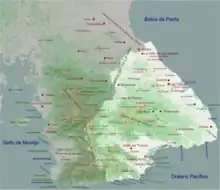 - Cordillera oriental de Azuero o Sierra del Canajagua, ocupa casi la mitad de la península de Azuero y se repliega y abulta hacia el sureste, extendiendo ramales hacia Punta Mala y Mariato.[33]