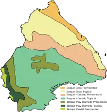 En el bosque tropical seco son abundantes el zorro, cedro amargo, laurel, cocobolo, guásimo,[42] quira, guayacán, pochote, caoba var humilis, guapinol, apamate, amates,[43] corotú, entre otros.[44][45] En los estratos intermedios podemos encontrar al jobo, madroño, toreta, el uvito, el cortezo, malagueto macho, guachapalí, caraño, mamey, caimito, guaba cansa boca, olivo, encino, trompito, harino, corozo, chacaj, cañafístula, arcabú, palo de la cruz, espino amarillo, muñeco, totumo, macano, acacia roja, María, pino y la Palma Real.