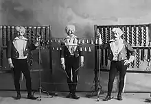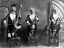 Los tres bemoles. Consiste la originalidad de estos artistas en producir bellas piezas musicales valiéndose de objetos que, por los usos a los que se destinan, están muy lejos de remplazar a los instrumentos de viento y cuerda. Actualmente trabajan en el Teatro Caracas donde son muy aplaudidos”. A pesar de la nota destacar la invención de algunos instrumentos, también se pueden observar en la foto la presencia de instrumentos conocidos como la guitarra, el violín, el xilófono, las campanas.[24] (Texto acompañando una fotografía del grupo).