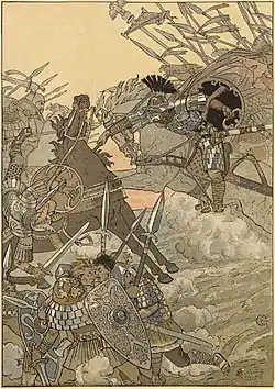 Yon se niega, pero Carlomagno recibe la ayuda con la presencia de Roldán, a quien acude.[lower-alpha 2] Roldán hace de Renaud su enemigo personal,[33] el cual regresa a París para burlarse de Carlomagno, que busca un caballo capaz de competir con Bayard, para ofrecérselo a Roldán. Con la ayuda del hechicero Maugis, disfraza a Bayard, participa en una carrera cerca de Montmartre, a orillas del Sena, y la gana, despojando a Carlomagno de su corona, como trofeo del ganador.[34][35]