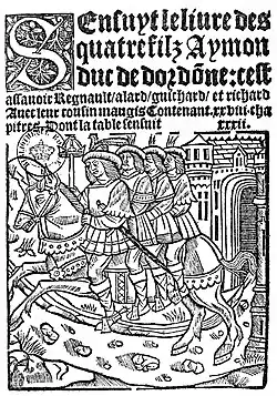 Micheline de Combarieu du Grès y Jean Subrenat consideran que esto nos impide hablar de un único cantar de Los cuatro hijos de Aymón, ya que hay grandes variaciones en torno al mismo tema.[106] Los manuscritos están a menudo incompletos, ninguno es una copia de otro.[107] Parecen carecer de cualidades literarias a primera vista, ya que están formados por elementos de diferentes autores en diferentes fechas.[108] La mayoría se remontan al siglo XIII. Todos son anónimos, excepto la novela L'Histoire des quatre fils Aymon atribuida a Huon de Villeneuve.[lower-alpha 6][109] Las primeras versiones francesas en prosa aparecieron a finales del siglo XII[110] y una versión en verso revisada circuló alrededor de un siglo después.[111] Jean Froissart, entre otros, recoge el relato de los hijos de Aymón en su Crónica (t. III, cap. XV).