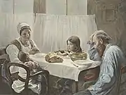 La composición posiblemente se inspira en el cuadro La comida familiar (1891) de la artista estadounidense Elizabeth Nourse, que comparte un escenario similar.[9][10] El cuadro de Nourse representa a una familia campesina francesa reunida en torno a una mesa;[11] una escena que le resultaría familiar a Tanner, ya que pasó su tiempo en Francia pintando en la campiña bretona, donde los campesinos locales eran uno de sus temas favoritos.[12] Dado que La comida familiar se expuso en la Exposición Universal de 1893, donde ganó una medalla de oro, Tanner pudo haber visto el cuadro cuando visitó Chicago ese año para presentar una conferencia en el Congreso Mundial sobre África.[10][13] También hay claros paralelos con el arte europeo, como el cuadro La oración antes de la comida (1660) de Jan Havicksz Steen.[10]