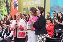 López (al centro) en una actividad junto a Michelle Bachelet y la ministra de la Mujer Claudia Pascual.